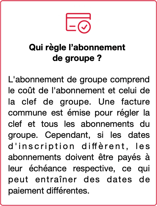 Pour simplifier le règlement, nous vous recommandons d'opter pour le prélèvement automatique. Si vous choisissez le prélèvement mensuel automatique, le premier paiement de l'année comprend à la fois l'abonnement du mois en cours et le coût de la clef. Les paiements suivants ne concernent que l'abonnement mensuel, offrant ainsi une gestion plus pratique de vos paiements tout au long de l'année.