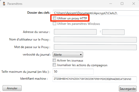 Il vous suffit juste d’aller dans les paramètres du Compagnon APICRYPT® et de décocher la case « Utiliser un proxy HTTP » puis « Sauvegarder » :